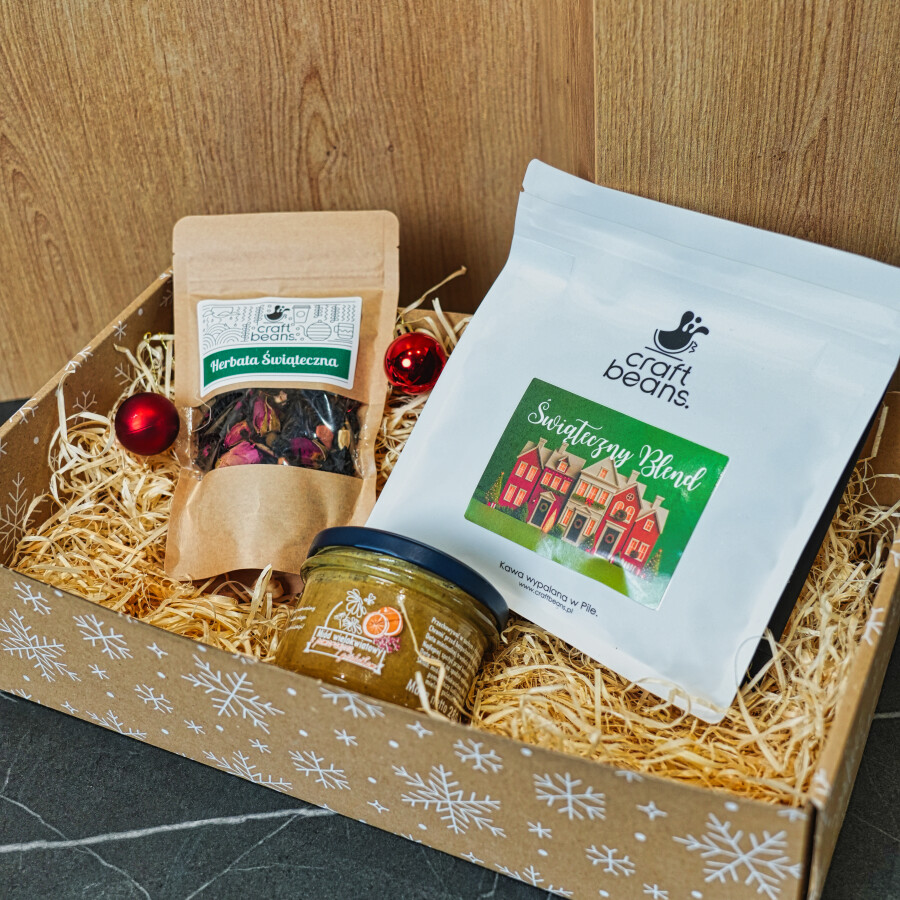 W zestawie znajduje się Świąteczny Blend – aromatyczna, rzemieślnicza kawa, która umili każdy grudniowy poranek. Obok niej czeka Herbata Świąteczna Craft Beans, pełna owoców, płatków i rozgrzewających korzennych akcentów. Idealnym dopełnieniem całości jest miód wielokwiatowy z pomarańczą i goździkami – delikatnie słodki, pachnący cytrusami i świętami, doskonały do herbaty, deserów lub jako samodzielna słodka przyjemność.