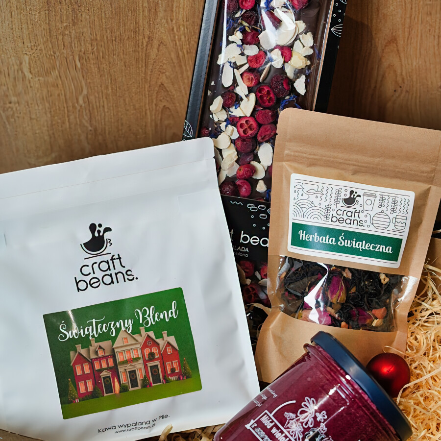 Zestaw „Śnieżynki” to wyjątkowa kompozycja smaków, która sprawi, że każda świąteczna chwila stanie się jeszcze bardziej magiczna. W zestawie znajdziesz aromatyczną kawę „Świąteczny Blend”, rozgrzewającą „Herbatę Świąteczną”, ręcznie robioną tabliczkę czekolady z orzechami i owocami, a także miód smakowy z lokalnej pasieki, które dodają lekkości i świeżości. Każdy element zestawu został starannie dobrany, aby zapewnić niezapomniane doznania smakowe, które zachwycą nawet najbardziej wymagających smakoszy.